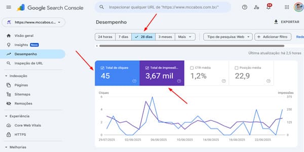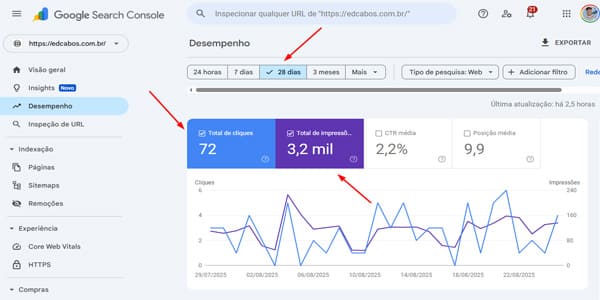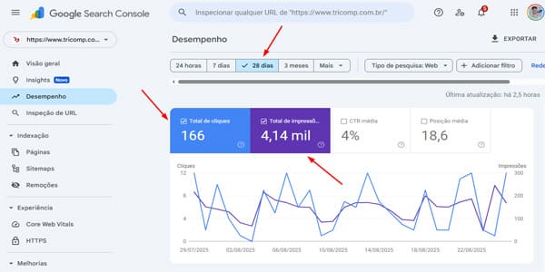 Os gráficos mostram na prática Como aparecer na busca do Google grátis. Com SEO bem estruturado, é possível aumentar cliques e impressões, conquistando mais visibilidade e atraindo clientes qualificados para o seu negócio.